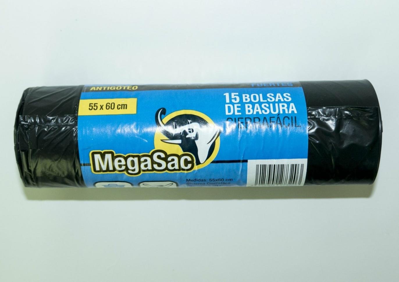 • Rollos de 15 bolsas de basura domésticas de color negro con cinta estranguladora cierra fácil de medida 55x60 cm.